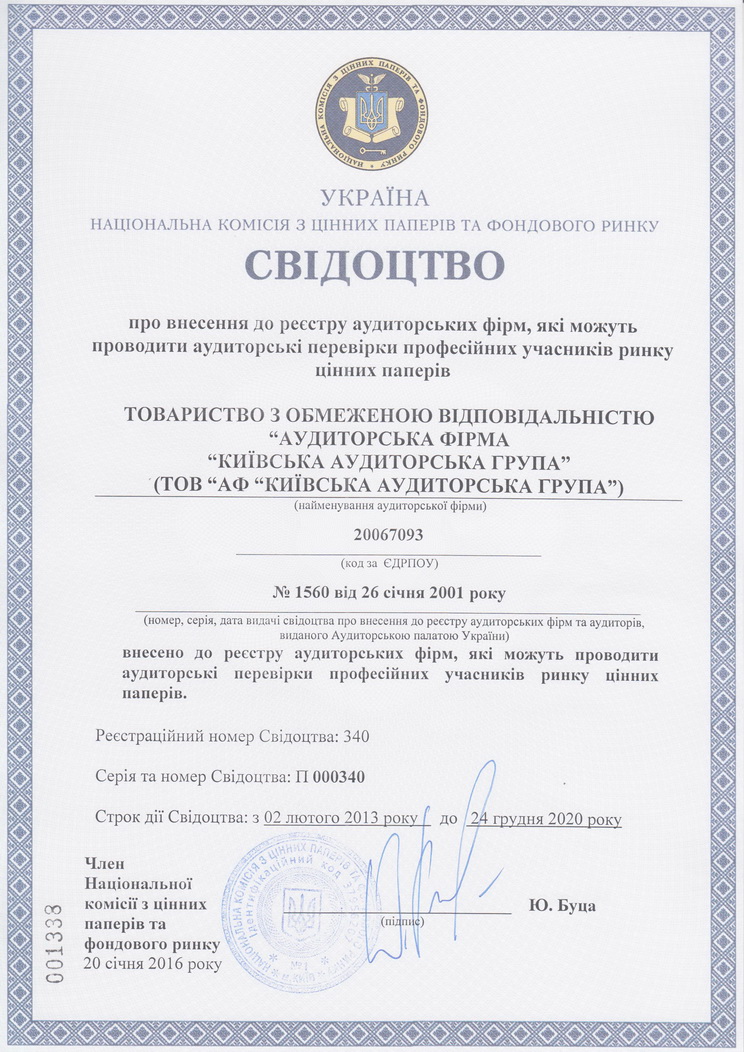 - Відповідність кваліфікаційним вимогам для проведення обов’язкового аудиту фінансової звітності акціонерних компаній, страхових компаній, емітентів цінних паперів, фінансових, банківських та небанківських установ (компанія у Реєстрі аудиторів Нацкомфінпослуг, НКЦПФР, Реєстрі АПУ, має сертифікати серії “Б”)