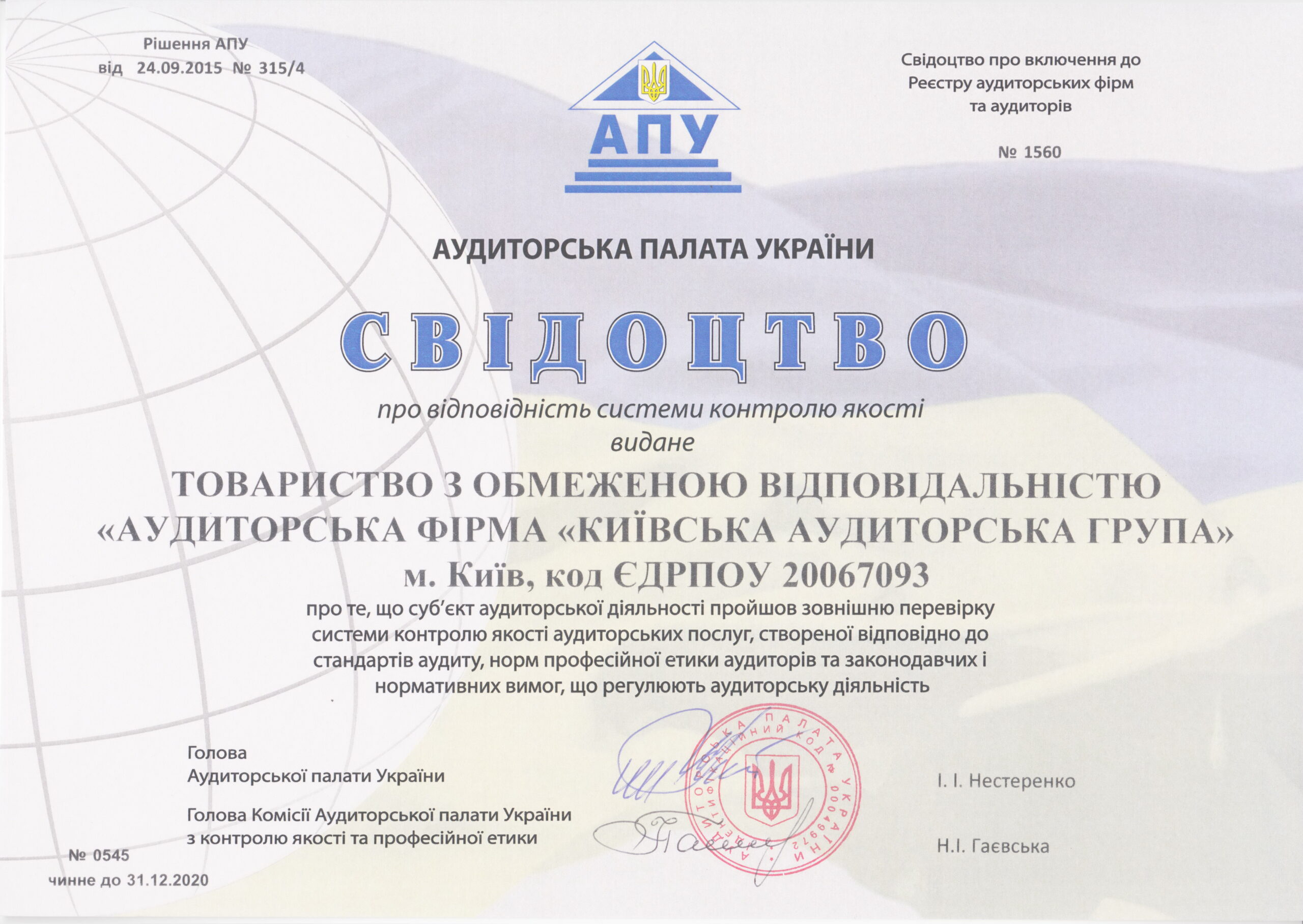 ТОВ «АФ «Київська Аудиторська Група» включено до Реєстру аудиторів та суб’єктів аудиторської діяльності, який веде Аудиторська палата України відповідно до вимог Закону №2258 – номер реєстрації 1560. Відомості про ТОВ «АФ «Київська аудиторська група» внесені до наступних розділів Реєстру аудиторів та суб’єктів аудиторської діяльності:
