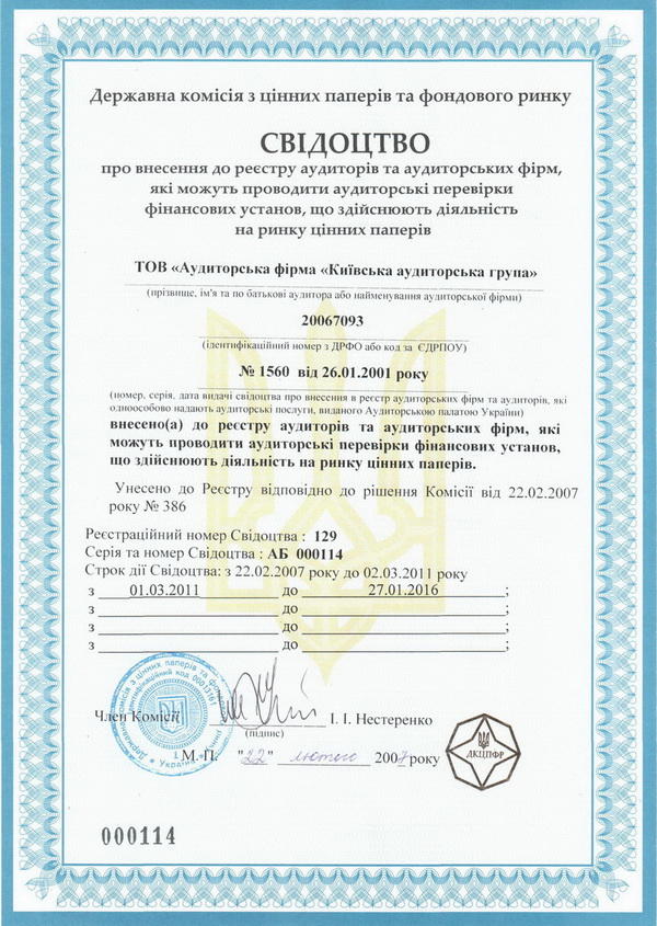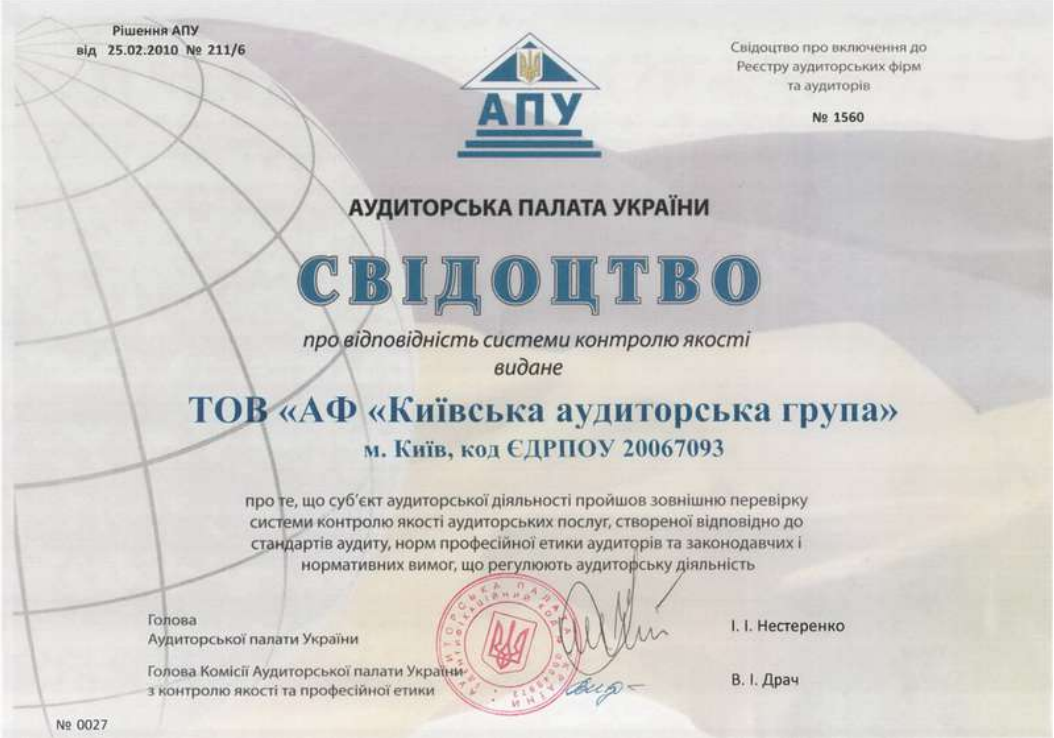 - сертифікат серії “А” №004881 від 30.11.2001р. на право здійснення аудиту підприємств різних форм власності на території України;